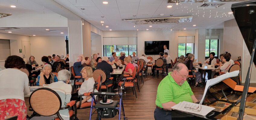 Their vision for the Tuesday Music Café was not to create a concert series or sing-along, but instead for Lee’s music to provide a calming backdrop for life at Hunters. Each week, Lee plays piano and occasionally harmonica while volunteers hand out pastries and residents sit and chat. As an experienced musician, Lee’s repertoire includes hundreds of songs, and his performance is largely improvised and original music.